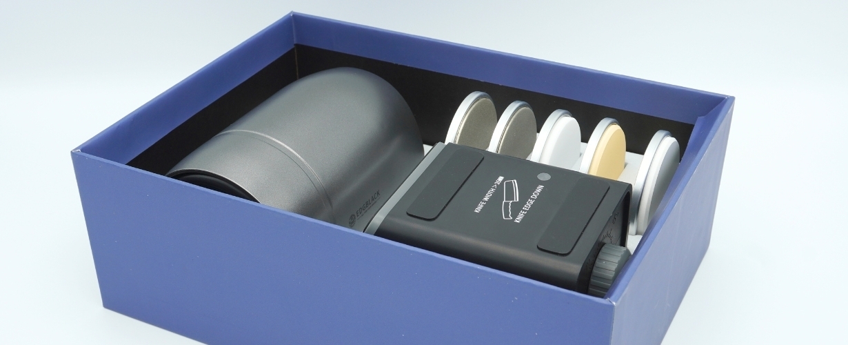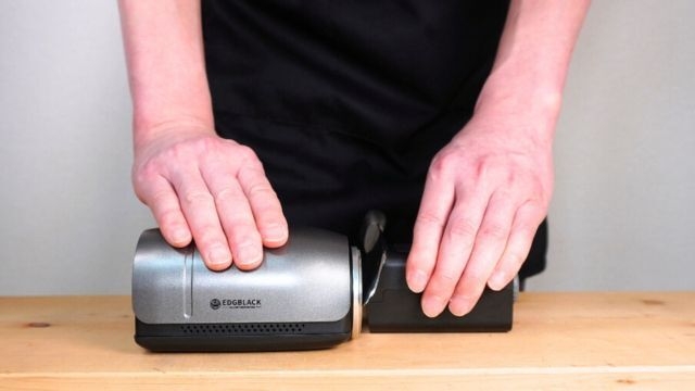 「EDGBLACK Electric Knife Sharpener」は、電動の転がす砥石でプロ級の仕上がりを実現する、簡単に早く砥げる、革新的な“電動包丁研ぎ器”です。