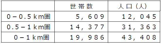 ・店舗から1㎞圏内は、単身世帯比率が40.5%、2人世帯が27.2%と全体の約7割が少人数世帯です。