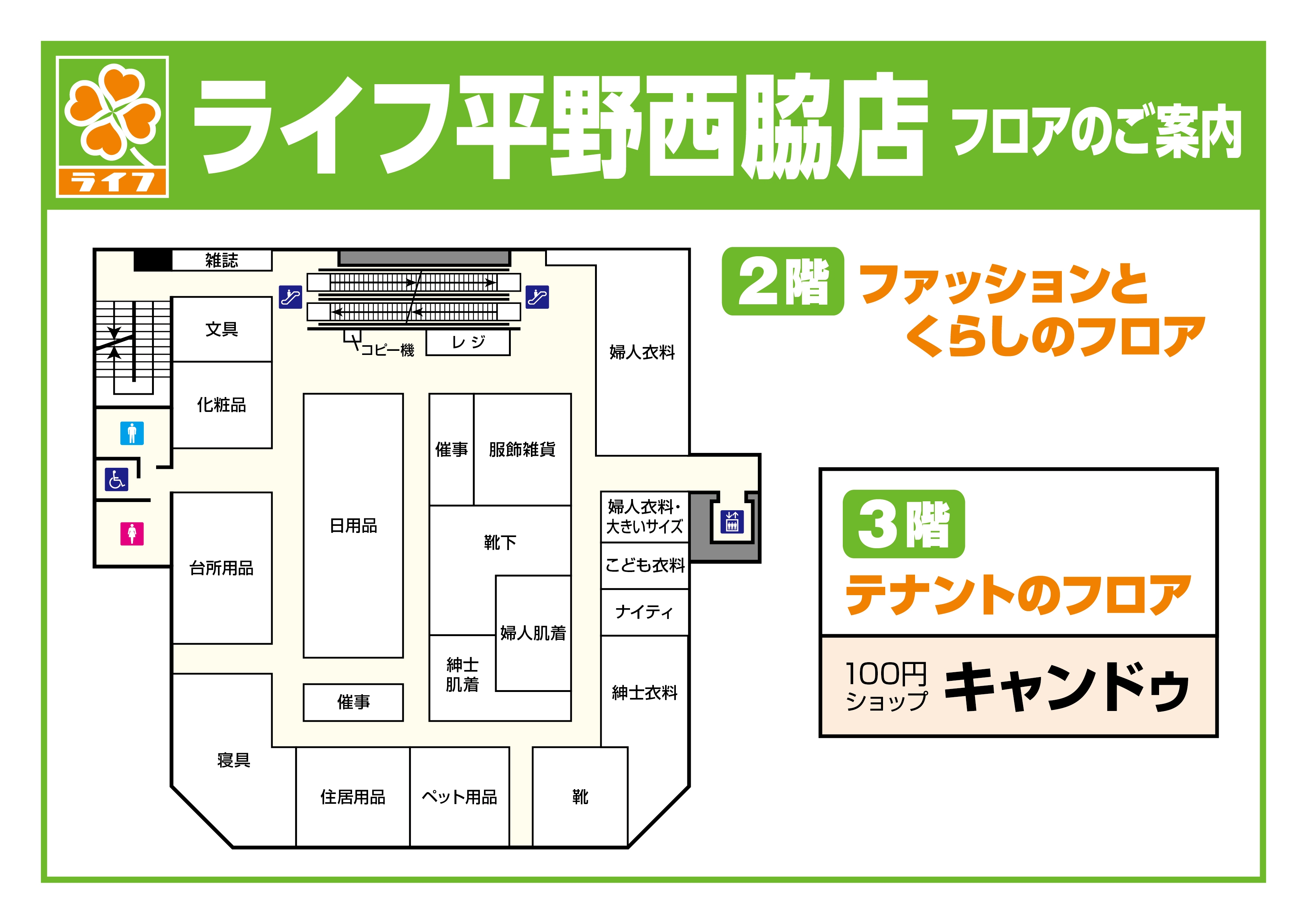 今回の改装では、店内のレイアウトと商品棚を変更し、品ぞろえを拡充いたしました。また、幅広い年齢層の方にお買い物をお楽しみいただけるよう、エレベーターを改装いたしました。さらに、3階の100円ショップ「キャンドゥ」も同時にリニューアルオープンいたします。