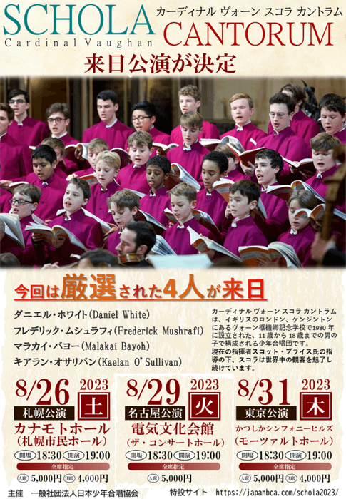 一般社団法人日本少年合唱協会主催、『カーディナル ヴォーン スコラ カントラム 来日公演』が札幌・名古屋・東京の3都市にて開催されます。