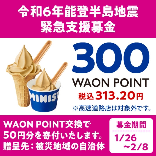 また、1月1日に発生しました能登半島地震への緊急支援募金を実施します。ミニストップアプリで、ほうじ茶ラテソフト通常販売価格(税込)313.20円を、300WAON POINTでお引き換えいただきますと、クーポン1枚あたり50円が被災地域の団体へ寄付され、復興支援のために使われます。