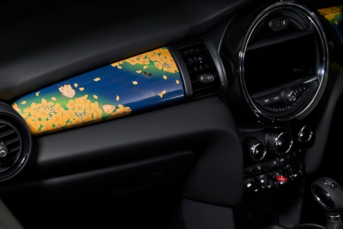 ・古都に代々伝わる紋章の一つ、「葵」から着想を得て、車内に自然を取り入れました。ドアインサートには京都の里山に射し込む木漏れ日を表現した西陣織、射し込む光をシートカバーの最高峰の技法、引箔で表現します。香りの器には葵があしらわれ、山に育成するその姿を連想させます。