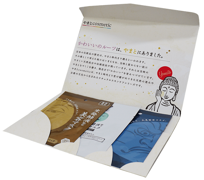 既存の「やまとcosmetic 美容マスク」の「仏顔ver(2019年2月発売)」と「つつまし顔ver(2024年9月発売)」、そして今回の新商品「すごみ顔ver」の3種をセットとし、パッケージには箔印刷やギフトシールなどの豪華な装飾を施すことで、一見すると本格的なコスメギフトとして演出しつつ、しかしケースを開けるとユニークなデザインの美容マスクが登場することで、ギフトを受け取った方の驚きや楽しさを一層高めます。