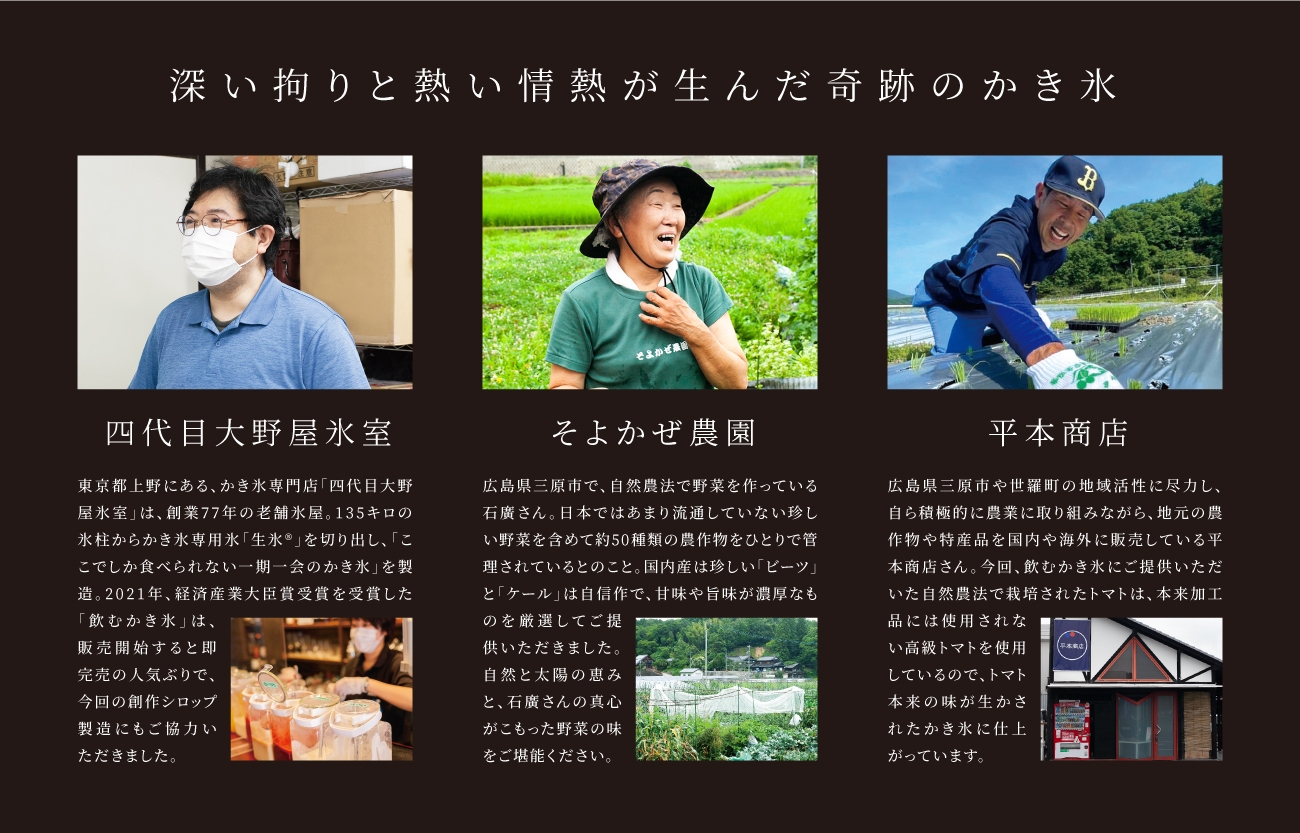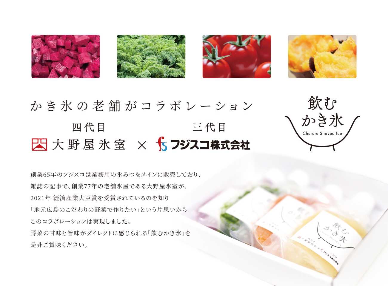 今年で創業65年となるフジスコでは氷みつは業務用をメインに販売しており、近年の消費動向に対応していきたいと思っていたところ、ある雑誌の記事で、氷屋である四代目大野屋氷室様が経済産業大臣賞を「飲むかき氷」という商品で受賞されており、アイデアと商品に感銘を受け「広島の地元のこだわりの野菜で作りたい」という片思いからこのコラボレーションは始まりました。