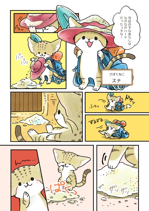 お砂糖の砂漠に住む、しゅがねこのスナのいえにまったりねこのマヌがやってきて…