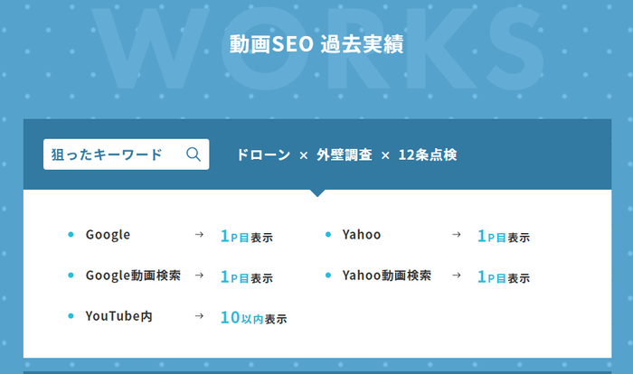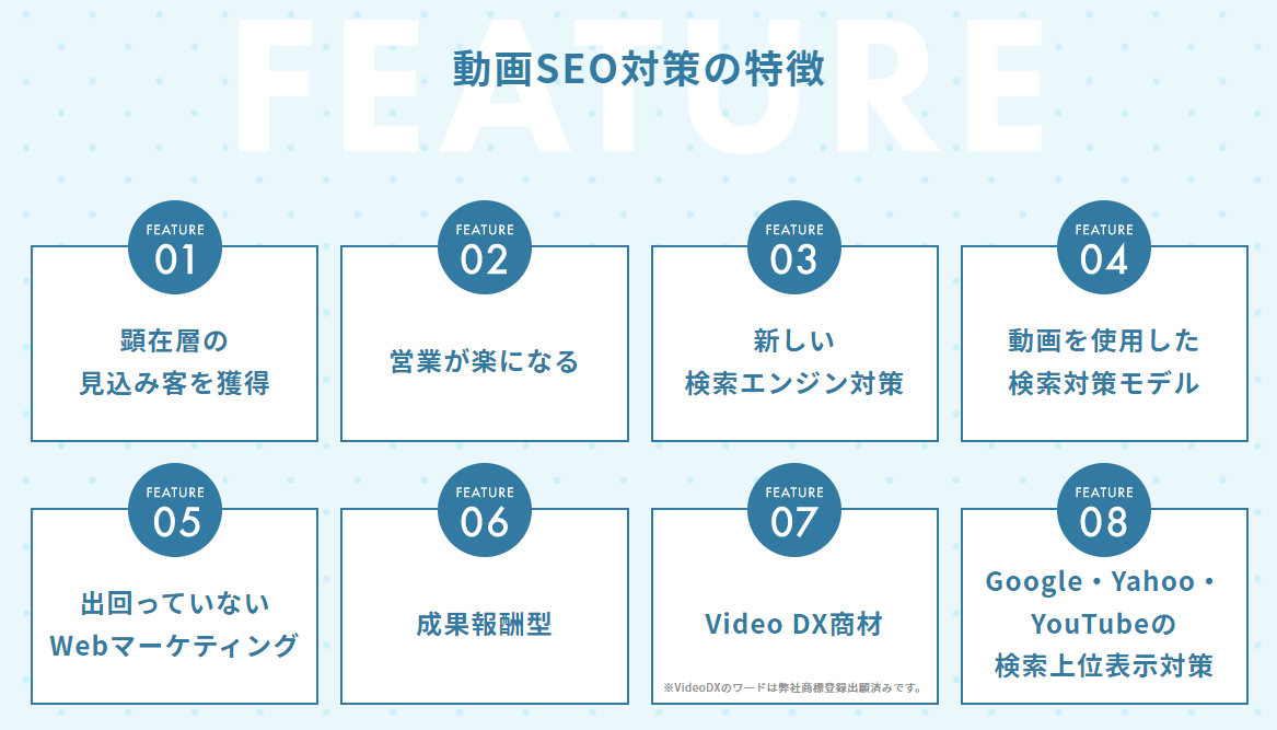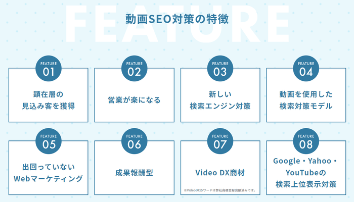 成功報酬型の動画SEO対策サービスは、当社調べでは世の中にまだ出ていないサービスです。