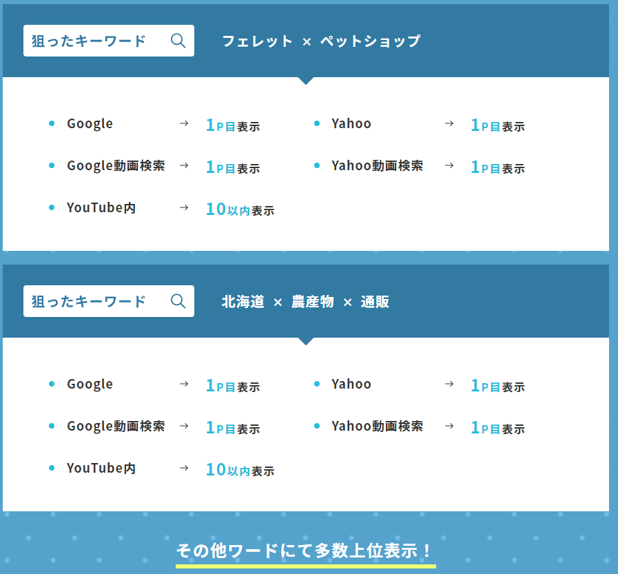 Google Yahooのキーワード検索のほかに、動画の特性上Google Yahooの動画絞り込み時の検索も対象になります。