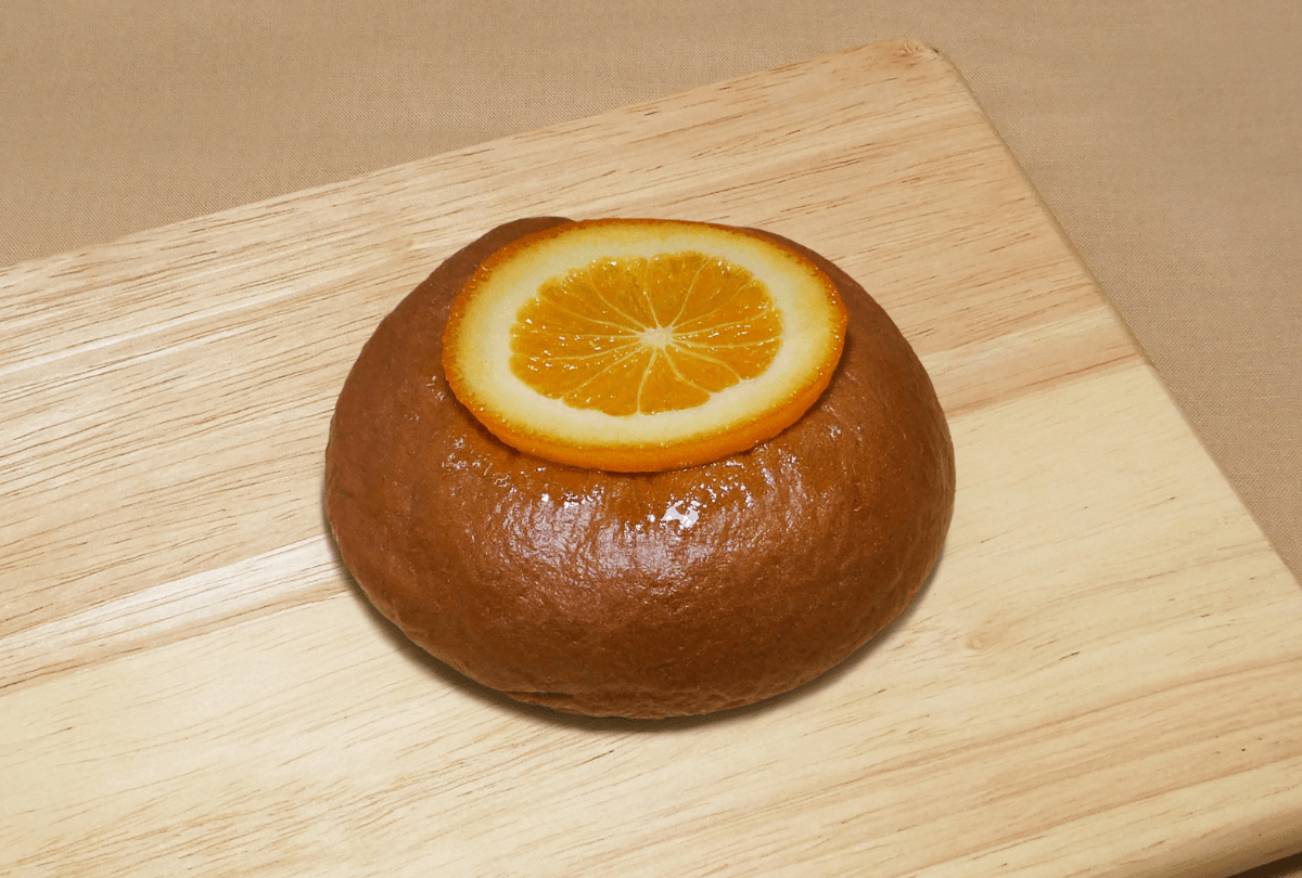 ほんのりビターなココア風味のベーグル生地に、オレンジピールとチョコチップを入れました。見た目華やかに輪切りのオレンジスライスをのせました。