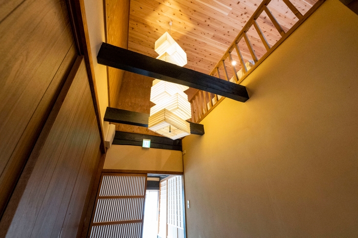 「西津湊かさまつ」の玄関を開けると、昔ながらの広々とした土間スペースが広がっています。この土間スペースには、サイクルスタンドを配置しており、美しい若狭湾沿岸をサイクリングする途中で、大切な自転車と共にゆっくりとお休みいただくことができます。