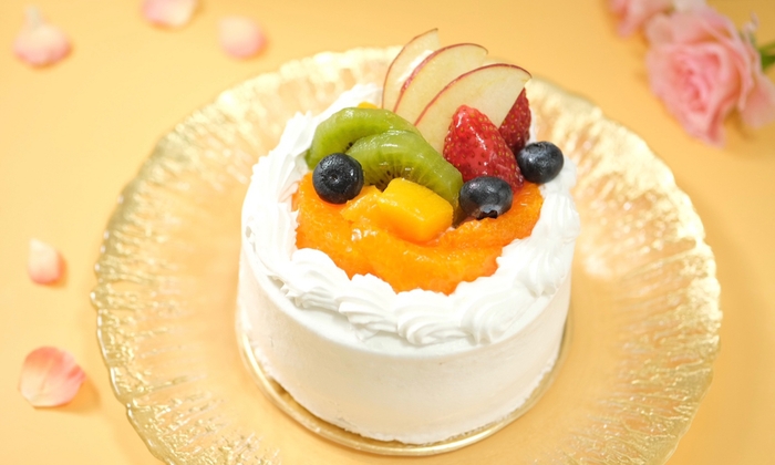 柑橘類の"せとか"・ピーチ・キウイ・ブルーベリー・イチゴなどをたっぷりと文頭使ったリッチなフルーツケーキ。