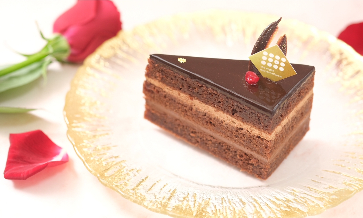 ザ ヴィーガン マシュマロのシグネチャーケーキであるヴィーガンチョコレートケーキを配送でお届けします。