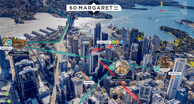 ・シドニートレイン「Wynyard」駅直結。LRT(路面電車)の駅やバス停にも近い好立地。