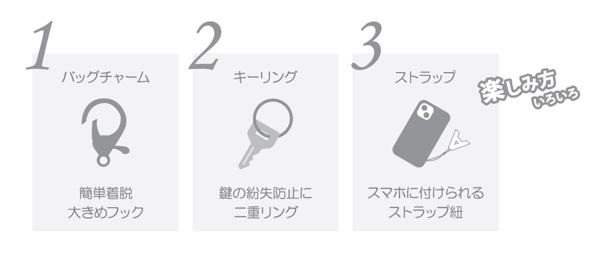 大きめフックもついていますのでバッグの持ち手に付けることも可能です。キーリングはカギの紛失防止の2重リングを採用。スマホケースに取り付けが容易なように、ストラップ紐もついております。