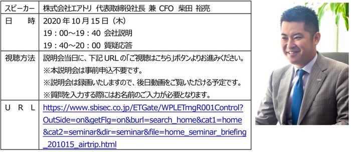 One Asiaのビジョンをかかげ、アジアを舞台に、エアトリ旅行事業、訪日旅行事業、ITオフショア開発事業、ライフイノベーション事業と投資事業を手掛ける株式会社エアトリ(本社:東京都港区、代表取締役社長 兼 CFO:柴田 裕亮、証券コード:6191、以下当社) は、10月15日(木)19:00より、株式会社SBI証券のご協力のもと「個人投資家向けオンライン会社説明会」を開催いたします。今回の会社説明会では、代表取締役社長 兼 CFOの柴田 裕亮より、当社の直近の状況も踏まえた経営方針、戦略等についてご説明させて頂きます。
