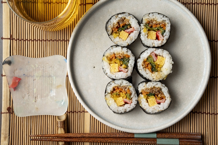 「野菜キンパ」には、にんじんやごぼう、たくあんなど、しゃきしゃきとした歯ごたえが楽しい野菜をたっぷりと巻き込みました。素材の風味を活かしたやさしい味わいは、後味もすっきり。冷たいお茶と一緒に、涼やかにお召し上がりいただけます。