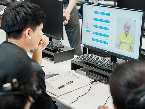 ヘッドフォンをつけた学生がアバターの幸男さんに「こんにちは。今日は在宅での治療方針について確認させてください。よろしくお願いします」と話しかけると、幸男さんは少々硬い表情で「よろしく」と答えます。会話の内容はモニター上に文字で表示されるので、ヘッドフォンをつけていない学生も流れを把握できます。杓子定規な問いかけだけでは、「そうだねぇ…」と気のない返事を返すばかりの幸男さん。1回目のトライで、患者の本音を聞き出すことの難しさを体感した学生たちは、次の作戦を議論し再度挑戦します。
