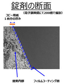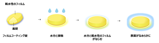 実際に、錠剤を飲み込むときの状況を再現して錠剤のすべりやすさ(するんと感)を確認したところ、フィルムコーティングによって、すべりにくさを減らすことができました。