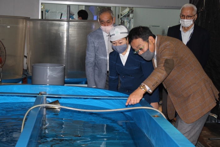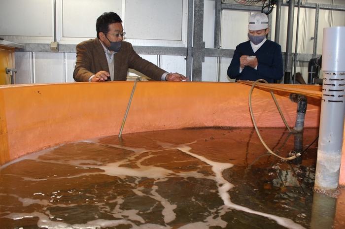 この日、立志教育支援フォーラムの白重俊介・実行委員長とともに山本准教授のもとを訪れた片山君。動画で好適環境水の説明を受けた後、早速、35トン水槽3基で養殖されている約5000匹のウナギと対面し、感激した様子。魚の排泄物を利用した野菜栽培「アクアポニックス」の装置も見学し、「好適環境水が海の魚と野菜を同時に育てられるのがすごいと思いました。これだけたくさんのウナギを同時に養殖しているのも驚きました」と感想を述べ、「ウナギ養殖をしたい気持ちが一層強くなりました」と話していました。