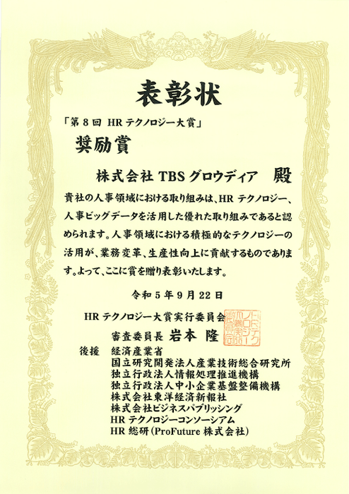 株式会社TBSグロウディア(東京都港区、代表取締役:園田憲)は、社内交流サイト「グロウディアずかん」にて、第8回HRテクノロジー大賞「奨励賞」を受賞し、9月22日に授賞式が行われました。