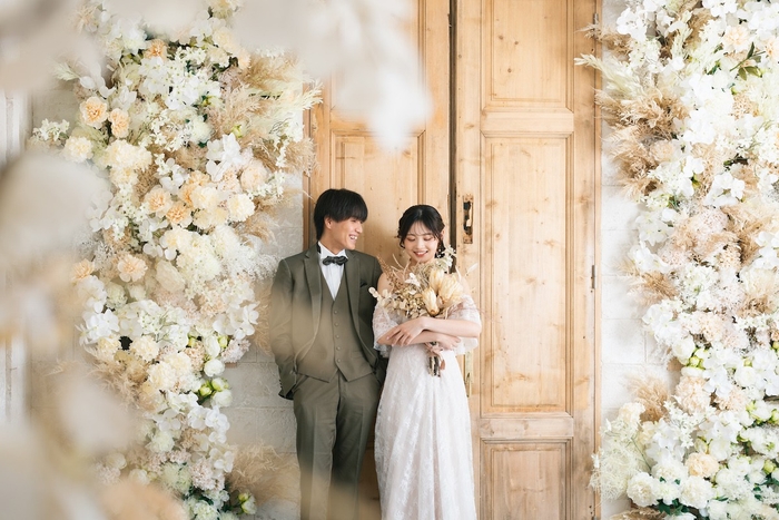 なんばパークス店自慢のチャペルスタジオが、より多くの花で彩られました。やわらかい色味のお花に囲まれて、一気に祝福ムードに包まれます。