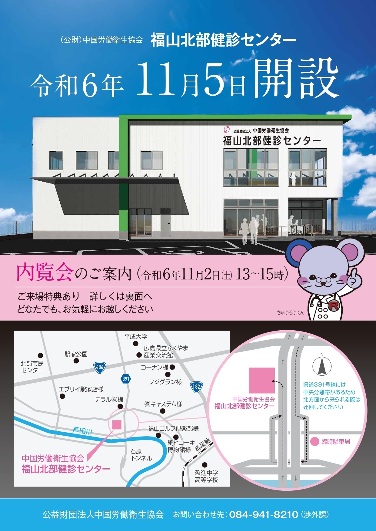 中国労働衛生協会は、令和6年11月5日に福山市北部エリアの御幸町に「福山北部健診センター」を開設いたします。「福山北部健診センター」は、最新の医療機器を導入し、幅広い健診サービスが提供可能になり、多くの皆様にスムーズに健康診断をご利用いただけるようになります。また、地域の皆様の健康意識の向上を目指して健康セミナーなどのイベントも定期的に開催すると同時に、予防医療の面から地域に貢献したいと思います。