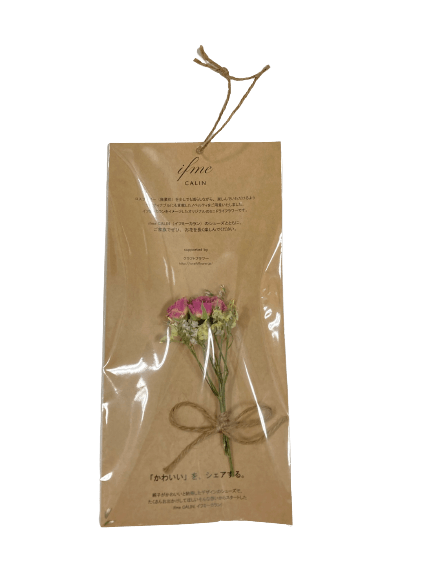 お花をモチーフとすることの多いイフミーカランでは、ロスフラワーが少しでも改善されたらという想いから、まだまだ綺麗な生花を捨てられてしまう前にドライフラワーにし、今回のノベルティー用にCALINをイメージした可愛いミニブーケに仕上げました。CALINをイメージしたお花を通じて、親子での会話は生まれたらという想いを込めたノベルティーです。ぜひこの機会に商品をご覧くださいませ。