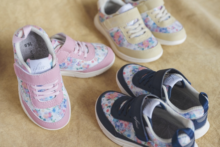 イフミーカランは、“かわいいをシェアする”というコンセプトの下、ママとお子様が共に納得するシューズを展開しています。人気の「wild flower series」は水彩画家の一栁綾乃さんのイラストを、タンネームにあしらい、リボンがポイントのデザインです。