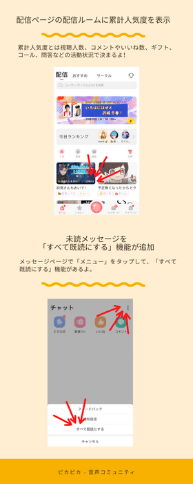 最新バージョンでは、投稿がランキングに表示されることとなり、人気ランキングと人気急上昇な投稿が一目瞭然となりました。今までピカピカは投稿者のために、投稿機能に数十回のアップデートを行いました。現在、リスナーは好きな投稿者を応援するには、投稿者の作品をいいね、コメントするだけではなく、ギフティングもできます。投稿者は最大5minの作品をアップしてアピールできますし、リスナーによるギフティングももらえます。そして、リスナーと理解と絆を深めるには、ライブ配信を行ってリスナーとコミュニケーションを行うこともできます。さらに、サークル機能を使って、リスナーと専用な空間を作って限定情報を発信したり日常の気持ちを伝えたりして、ファンとやりとりを行うこともできます。