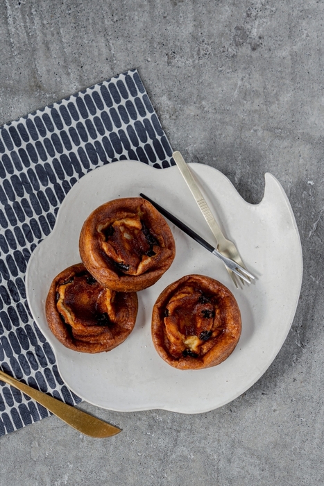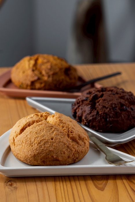 フランスKAOKA社の有機カカオ・チョコレートを使用。濃厚なショコラ生地にミルクとキャラメルのチョコレートを合わせ、香り豊かで奥行きのある味わいに。3種のショコラ使用した贅沢なスコーンです。