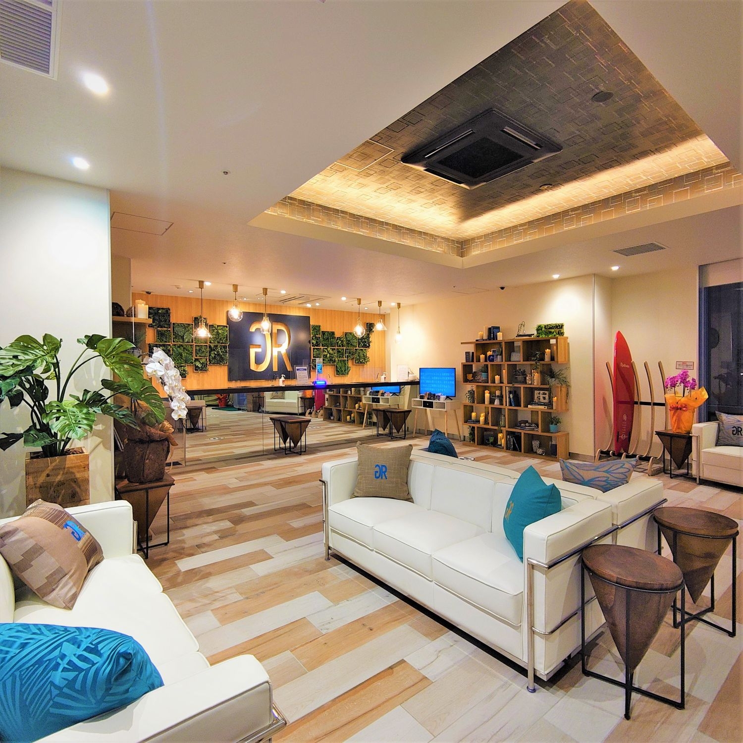 コンセプトである「海」・「太陽」をもとに、コバルトブルーを基調とし海をイメージしたエントランスから砂浜イメージのフロントへ流れるように。
