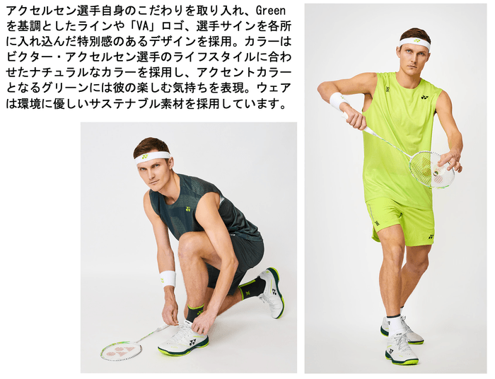 アクセルセン選手は、選手としての実績だけでなく、外国語の習得やジュニアの育成などに積極的に取り組む姿勢や、誠実で明るく気さくな人間性で関係者やファンからも慕われる存在でもあります。本コレクションの発売を通じて、そんな彼の人間性についてもっと多くの方に知っていただきたい、バドミントンをさらにグローバルに発展させていきたい、という弊社からの願いも込められています。