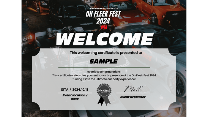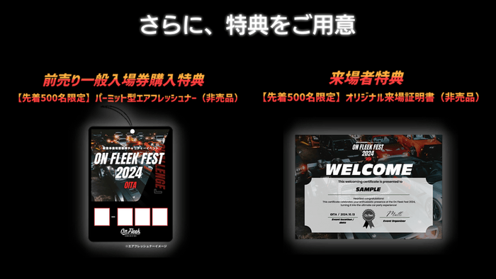 On Fleek公式オンラインショップで前売り一般入場チケットをご購入いただいた方に、イベントパーミット型のエアフレッシュナーと薬用長湯ホットタブをプレゼント!また、エントリー早期特典として愛車が公式ホームページに掲載されるチャンスもご用意しております。