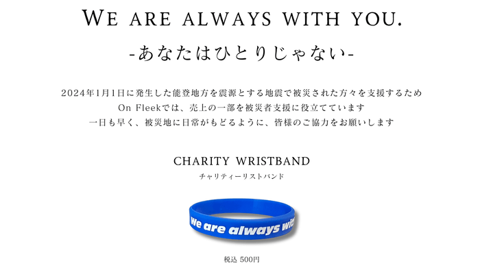 今回のイベントでは、能登半島地震の被害を受けられた方へ、復興支援の一助として、チャリティーリストバンドの販売をさせていただき、売上の一部を寄付させていただきたいと考えております。