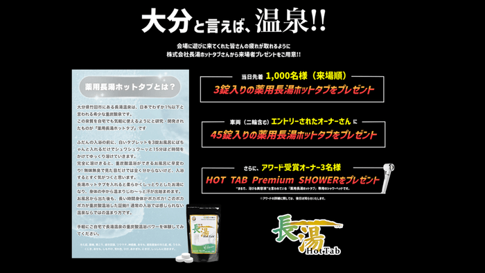 大分県は“おんせん県おおいた”と呼ばれるほど、県内各地に様々な温泉があります。その中でも大分県竹田市にある長湯温泉は、日本でわずか1%以下と言われる希少な重炭酸泉です。この泉質を自宅でも気軽に使えるようにと研究・開発された入浴剤 薬用長湯ホットタブをゲストへプレゼントします!会場に来場された方々の疲れをとると共に、大分県の温泉を堪能してもらいたいと思います。