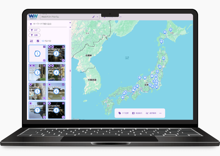 撮影地点をピン表示し、位置情報とコメントを可視化。