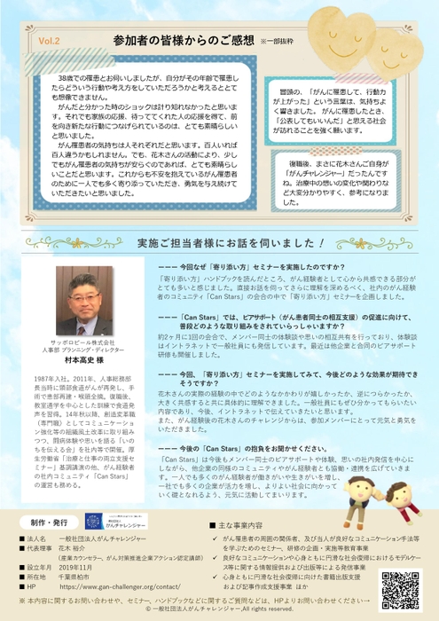 一般社団法人がんチャレンジャー(所在地:千葉県柏市、代表理事:花木裕介)は、2020年11月より、「がん罹患者にかかわる方必携『寄り添い方』ハンドブック」(発行:一般社団法人がんチャレンジャー)の内容をベースとした、「寄り添い方セミナー」のご提供を本格スタートいたしました。
