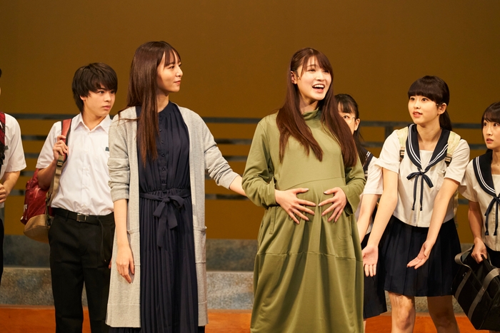 主人公ユリの中学時代の同級生・松山ハルコを演じるのは、森保と同じくHKT48のメンバーとして活躍していた神志那結衣。「私は先生で妊婦の役なんですけど、しっかりと生徒のみんなと一緒にユリを引っ張っていけるように努めて参ります」と役柄を説明しつつ意気込みを伝え、「しばらく会っていなかったので、最初はちょっと壁があったような気がするんですけど、稽古を重ねていくうちに思い出してきて、最終稽古に近づいた頃には親友という関係が出来上がっていました」と森保との共演についての思いを語った。