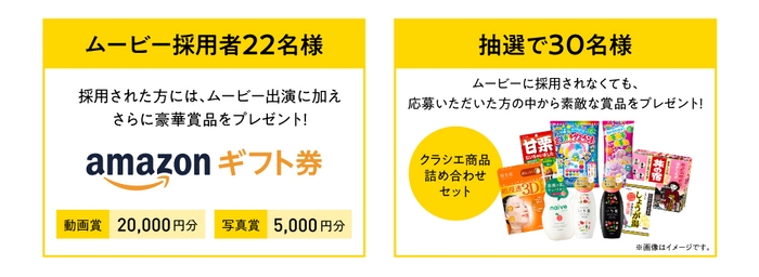 動画が採用された方には動画賞のAmazonギフト券2万円分、写真が採用された方には写真賞Amazonギフト券5千円分!