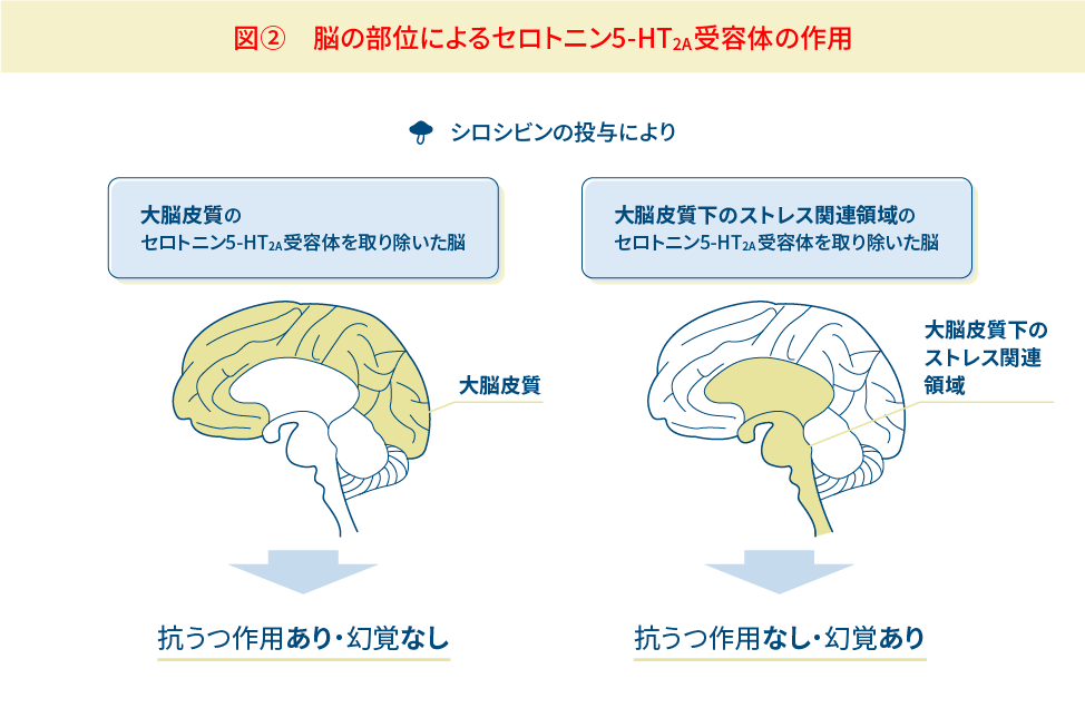 セロトニン5-HT2A受容体は脳のさまざまな部位に発現するのですが、部位によって発現量や周囲の環境が異なり、シロシビンの作用も変わってくると考えられます。そこでマウスの脳から、ある領域のセロトニン5-HT2A受容体を遺伝的に取り除いてシロシビンを投与する実験を行いました。一つは大脳皮質、もう一つはその内側にある大脳皮質下のうち、よく分かっていないものの「ストレス関連領域」と考えられている領域です。すると、大脳皮質のセロトニン5-HT2A受容体を取り除いたマウスでは幻覚が起きず、抗うつ作用を発揮。一方、大脳皮質下のセロトニン5-HT2A受容体を取り除いたマウスでは、幻覚が起き、抗うつ作用は出ないという結果が得られたのです(図(2))。