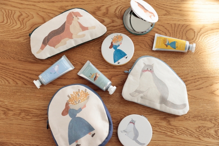 「犬猫 女の子デザインのポーチ&ハンドクリーム&ミラーの3点セット」:3名様