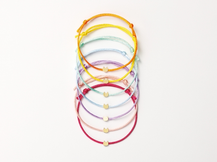 まんまるなお顔とピンと立った耳がキュートなネコのコードブレスレット。プレートの素材はK10YG10金イエローゴールド