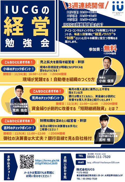 税理士法人を核に全国7拠点で中小企業の支援サービスを展開するアイユーコンサルティンググループ(東京都豊島区、岩永悠社長/出川裕基副社長)は、11/26から3週連続で財務に関する勉強会をオンラインにて開催致します。