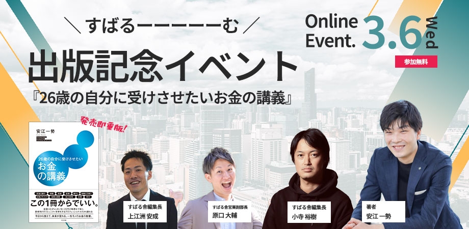 すばるーーーーーむVol.3!発売即重版決定『26歳の自分に受けさせたいお金の講義』出版記念【オンラインイベント】3月6日(水)20時開催! Guest:安江一勢先生!!