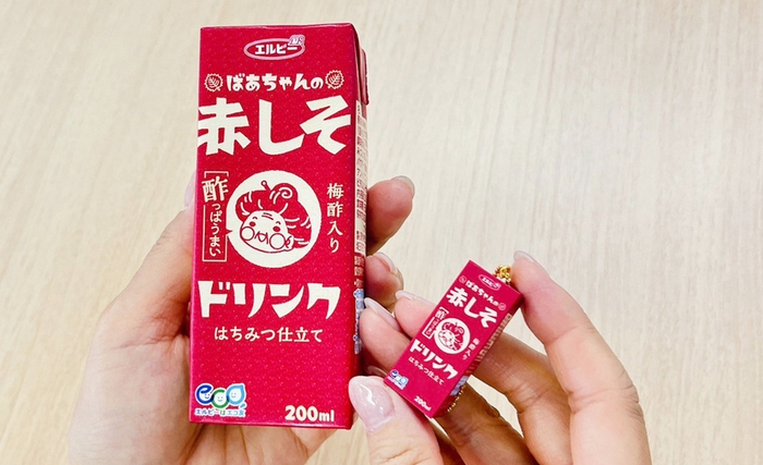 『エルビードリンク マスコットボールチェーン』は、株式会社エルビーの人気紙パックドリンク「ばあちゃんの赤しそドリンク、ブルーベリーアイ+、ぎゅっと果実+酢ざくろミックス、WorldTripマンゴーラッシー、大人の紅茶レモンティー、さわやか果物 もも水」のパッケージをそれぞれ小さいサイズで再現したものです。