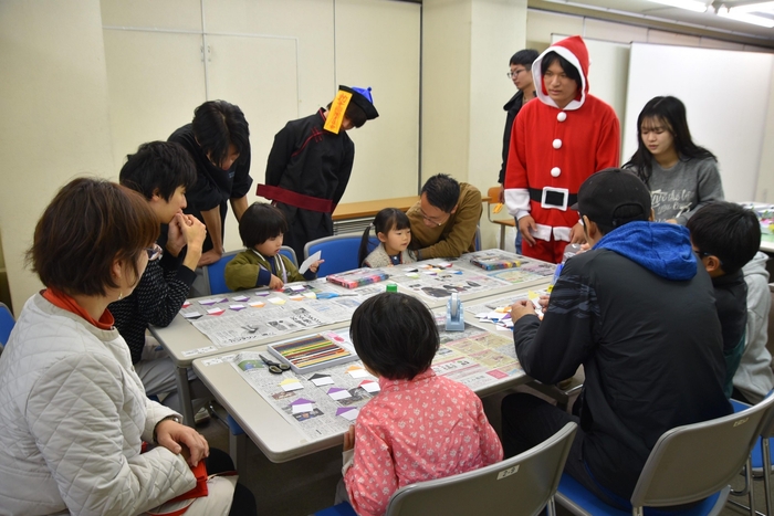 約1時間半後にロイヤル劇場ビルに戻った参加者は続いて、ペンや色鉛筆、シールを使って家の模型に色を塗って「こんな店があったらいいな」と考えたパン屋さんや車屋さん、宝石店や水族館などを次々と作り、怪盗Xに壊された商店街の模型を見事に完成させました。終了後、子どもたちは「サンタさんを追いかけるのが楽しかった」「お菓子をもらってうれしかった」と疲れも見せずに話していました。
