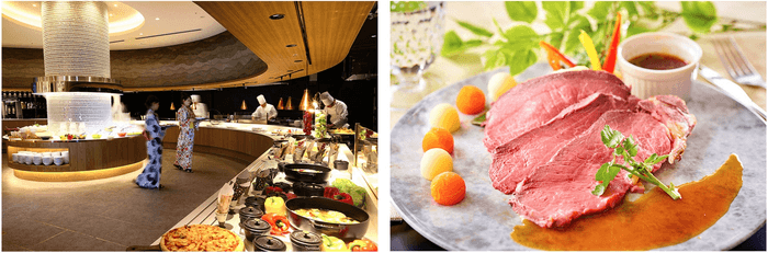 左:大きな弧を描くライブキッチンから提供する出来立て料理の美味しさはもちろん、笑顔の絶えないスタッフとの会話も食事の美味しさに華を添えます。