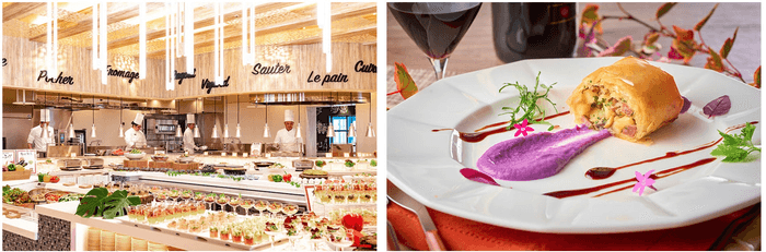 きびきびと立ち働くスタッフはもちろん、次はどの料理を食べようと悩むお客様の楽しそうな様子もレストランを活気づける大切な要素です。ライブキッチンでは定番のローストビーフの他にも、秋限定「鴨のパートフィロ包み」が登場します。鴨ときのこの旨味をパイ生地に閉じ込め、仕上げにトリュフ風味のソースを添えてご提供します。