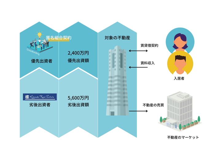 匿名組合契約を投資家の皆様と締結させて頂きます。優先出資と劣後出資による出資金をもとに対象不動産の取得・運営を行います。