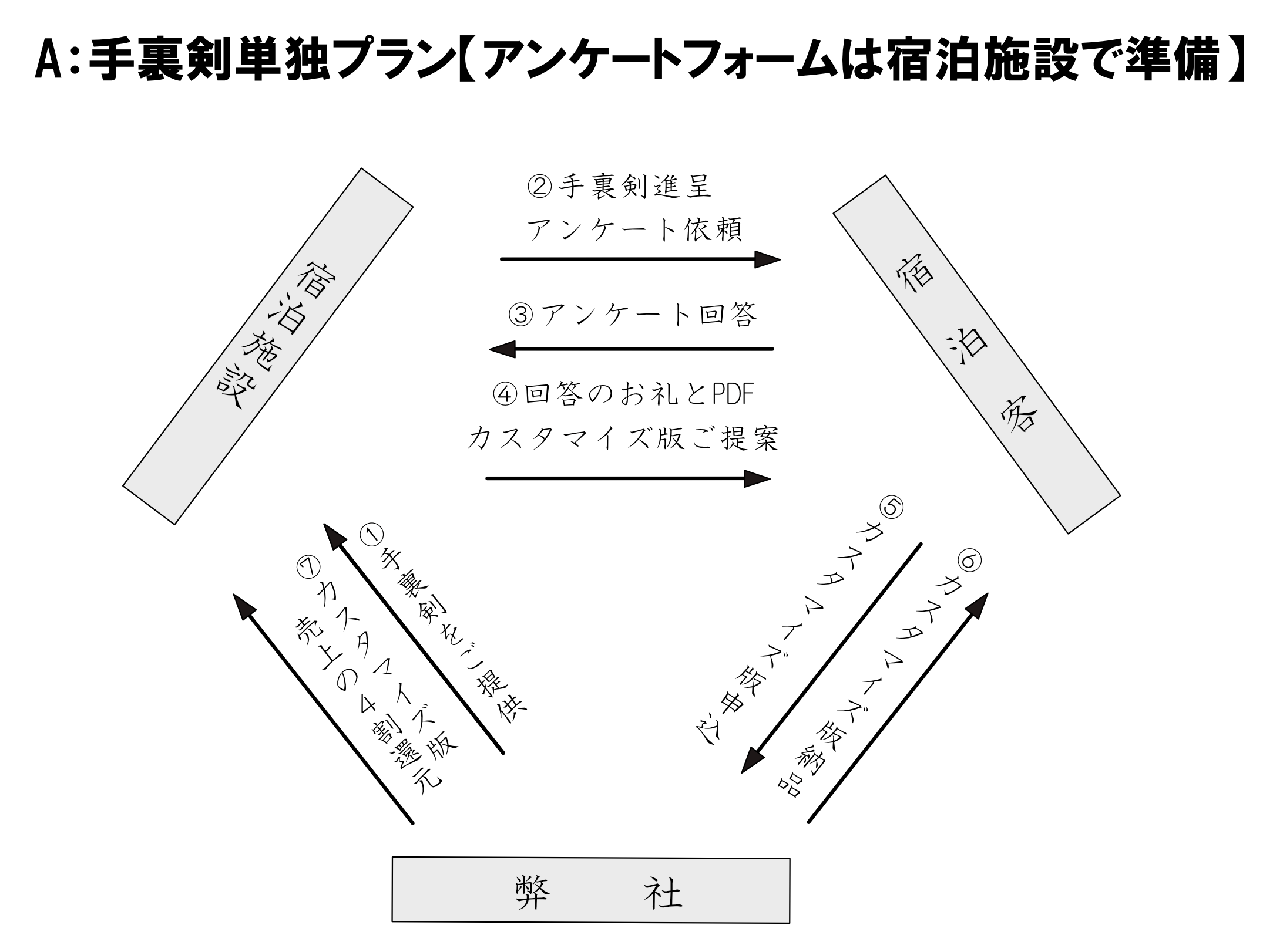宿泊施設側の追加料金は不要です。なお、この受託過程には宿泊施設の人員は介在させず、人的負担も増やしません。具体的には、アンケート回答のお礼として送信するメールの後半で案内します。