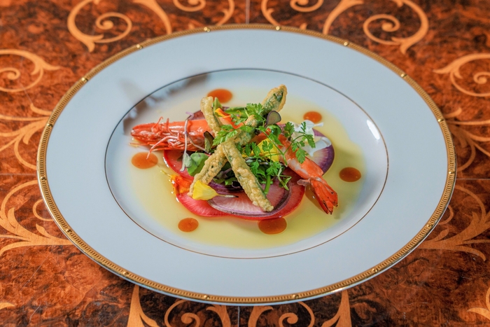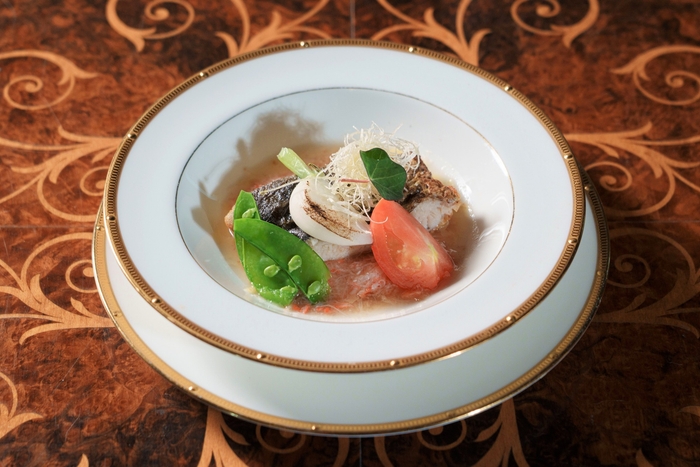 「華やかに、そして優雅に」をテーマに、心温まる全7品のコース料理をご用意。冬野菜の旨味と海の香りが溶け合うアミューズや、淡路島で獲れる足赤海老を旬の大根とインゲンで揚げた前菜、甘さ際立つ淡路島産玉ねぎと白ネギの旨味を閉じ込めたスープで身体も心もほっこりと。脂の乗った淡路島の寒鰆のローストは、魚介の出汁と香草が口いっぱいに広がる一品。メインには、淡路島を代表するブランド牛“淡路牛”をソテーと一緒に、フォアグラと里芋のテリーヌをお召し上がりください。最後には、甘酸っぱい冬苺をふんだんに使用した、上品な味わいのプリンで優しくコースを締めくくります。